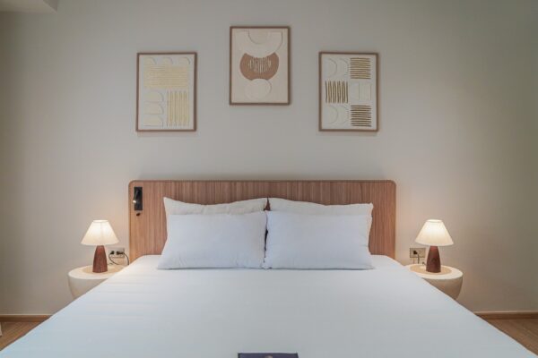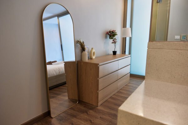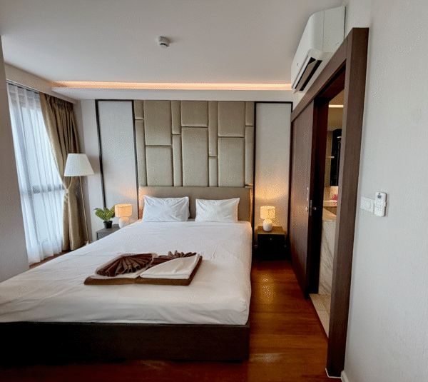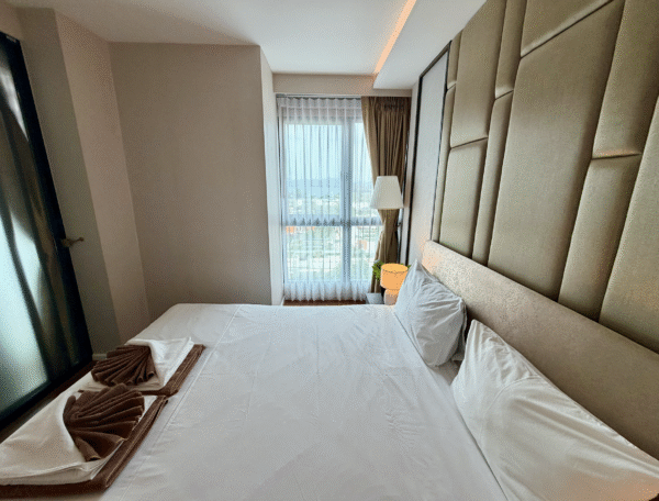 Мы жили на шестом этаже. Апартаменты были чистыми: чистое постельное бельё, полотенца, аккуратная уборка при заезде. В номере есть всё необходимое для проживания — посуда, кастрюли, столовые приборы, большой холодильник. Кровать удобная. Единственный небольшой минус — подушки: их было всего две и они не очень большие.