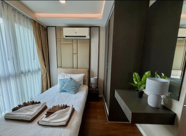 Рядом есть минимаркет, фруктовая лавка и кафе. До моря пешком 15–20 минут, на такси около 200 бат. В целом проживанием остались довольны.