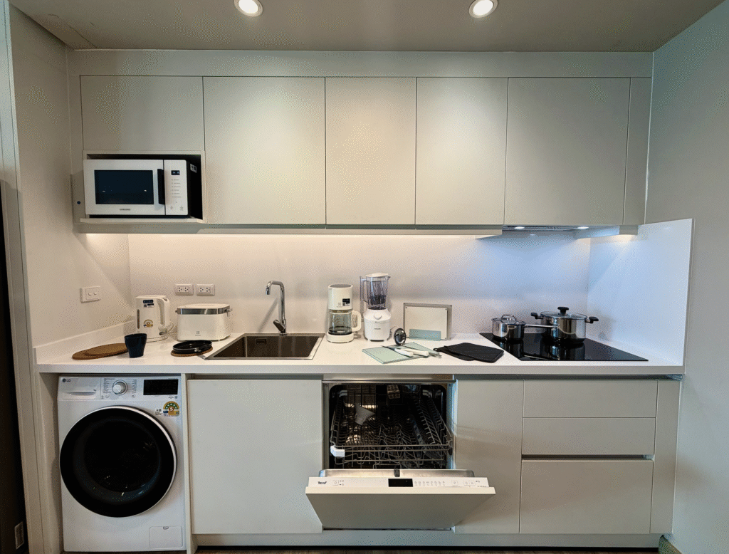 Мы жили на шестом этаже. Апартаменты были чистыми: чистое постельное бельё, полотенца, аккуратная уборка при заезде. В номере есть всё необходимое для проживания — посуда, кастрюли, столовые приборы, большой холодильник. Кровать удобная. Единственный небольшой минус — подушки: их было всего две и они не очень большие.