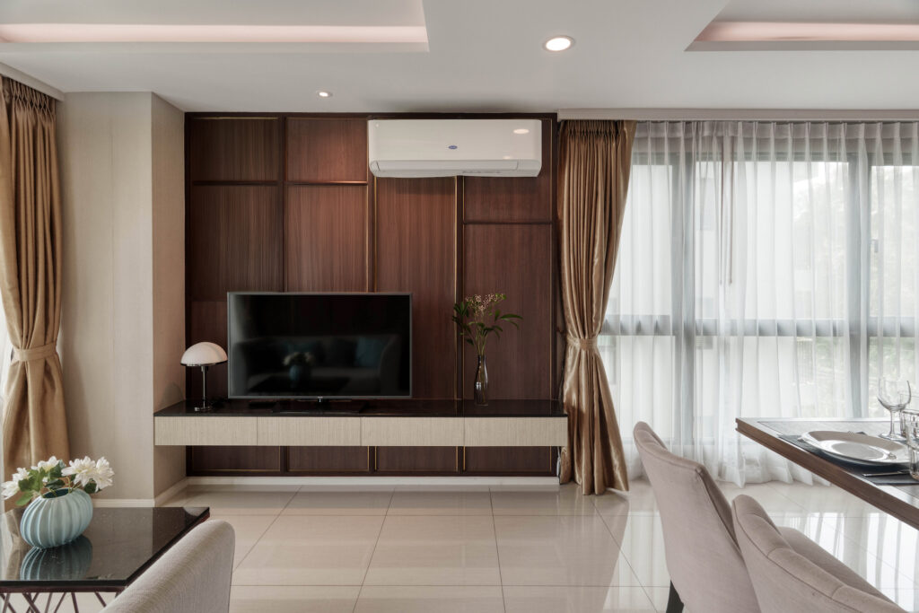 Все комнаты оснащены кондиционерами, чтобы в любую жару в квартире оставалось прохладно.