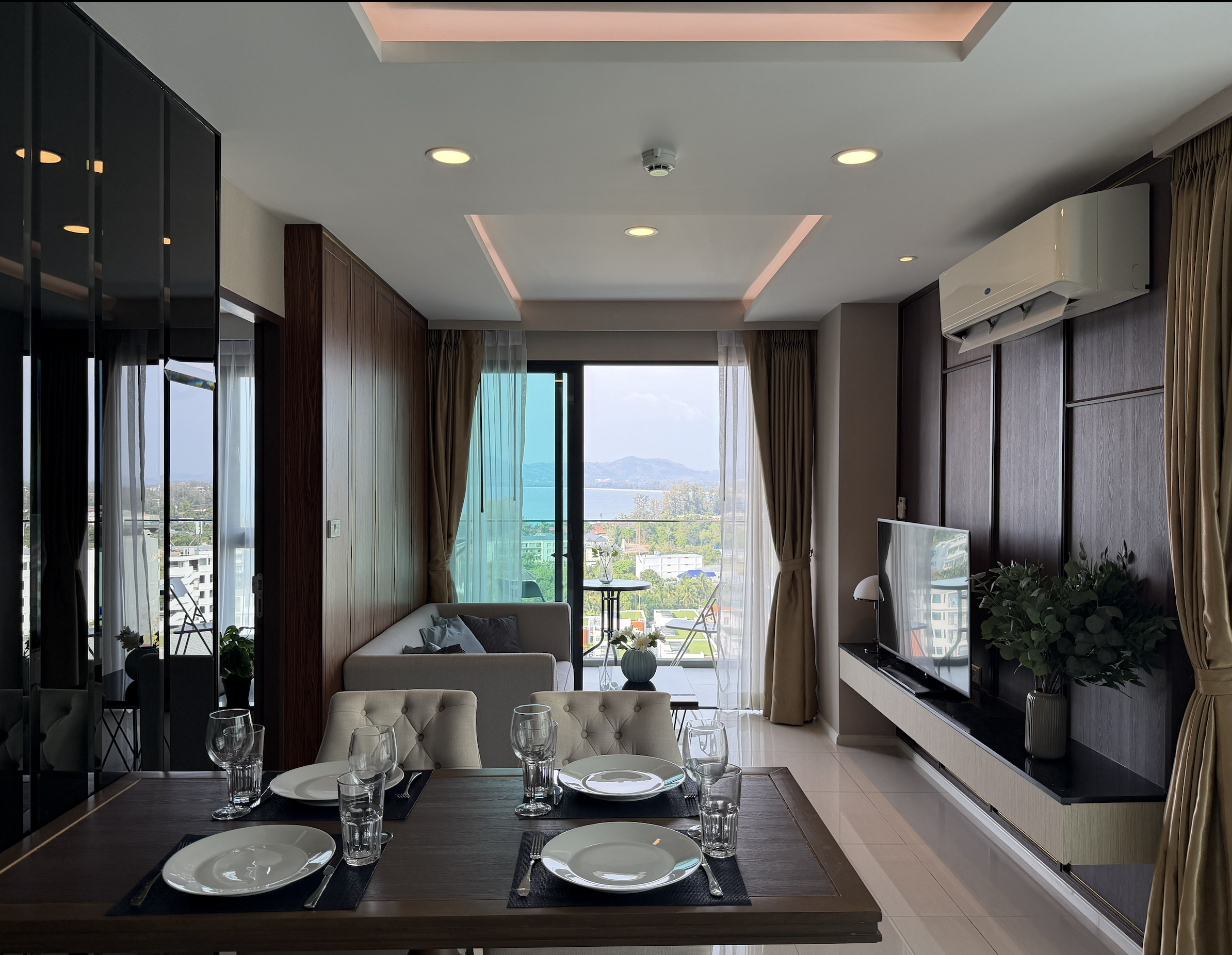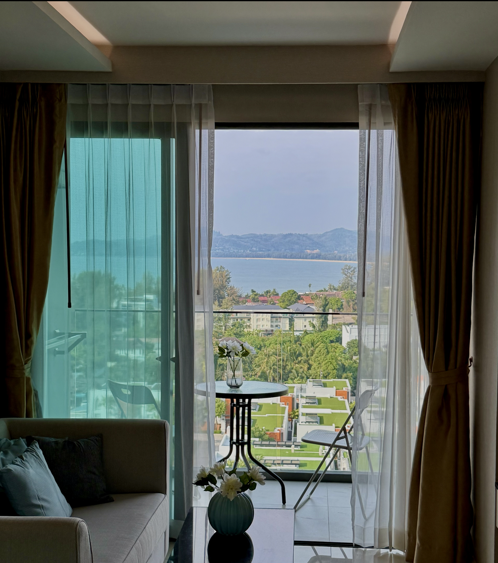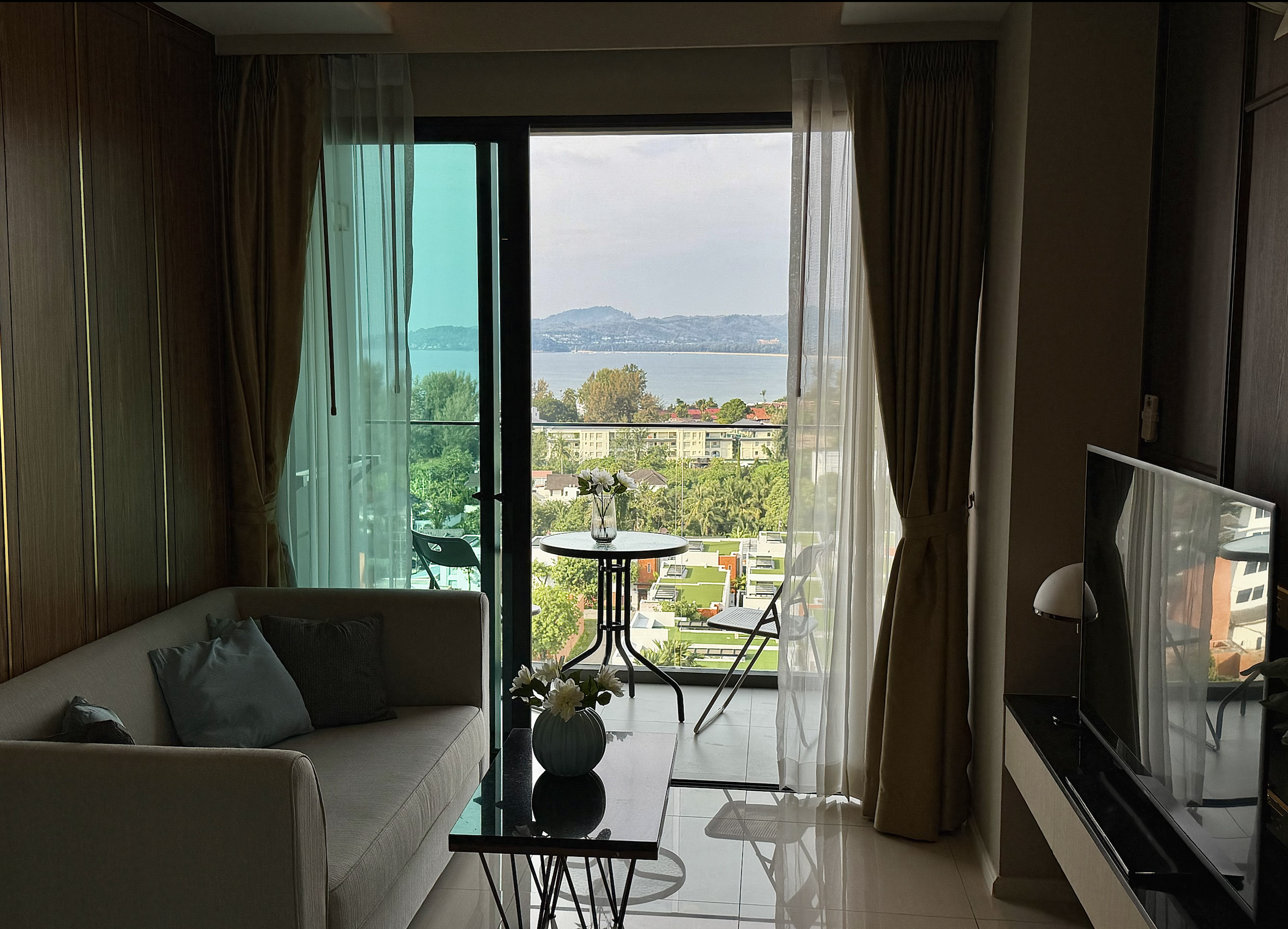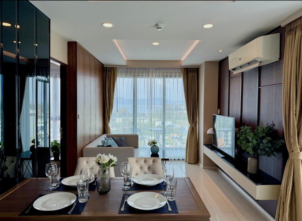 Представьте утро, когда море уже сияет в лучах солнца, а вы смотрите на него с 7 этажа, не вставая с дивана. Открываете окно — в квартиру заходит тёплый морской бриз и запах тропиков. До пляжа Сурин — всего несколько минут пути, а дома есть всё, чтобы жить так же комфортно, как в городе, только у моря.